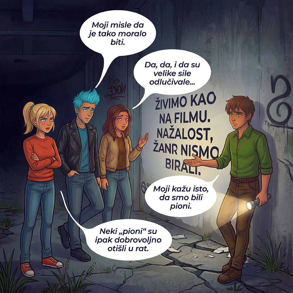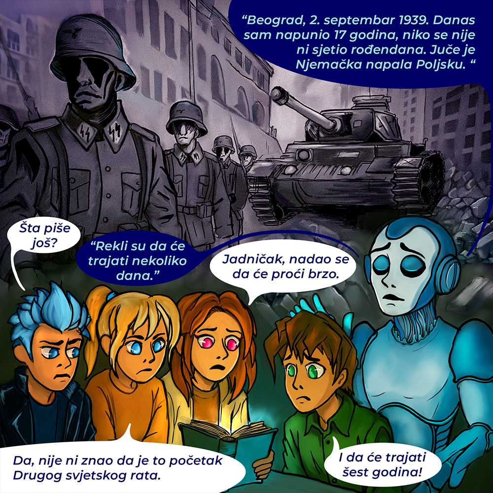U ovom stripu, učenici se suočavaju sa najmračnijim poglavljima 20. veka, gde se globalni konflikt susreće sa lokalnim borbama. Dok istražuju slom starih poredaka i uspon pokreta otpora, suočavaju se sa lepezom teških izbora i visokih uloga. Kako obični ljudi pronalaze svoj put kada svaka odluka nosi težinu izbora između života i smrti? Da li je moguće pronaći zajednički humanistički interes u svetu razorenom okupacijom i unutrašnjim podelama?