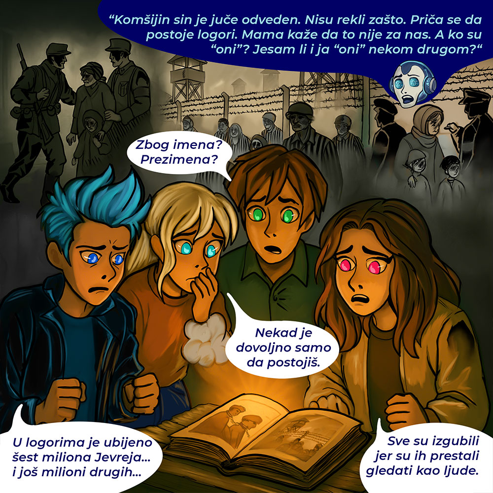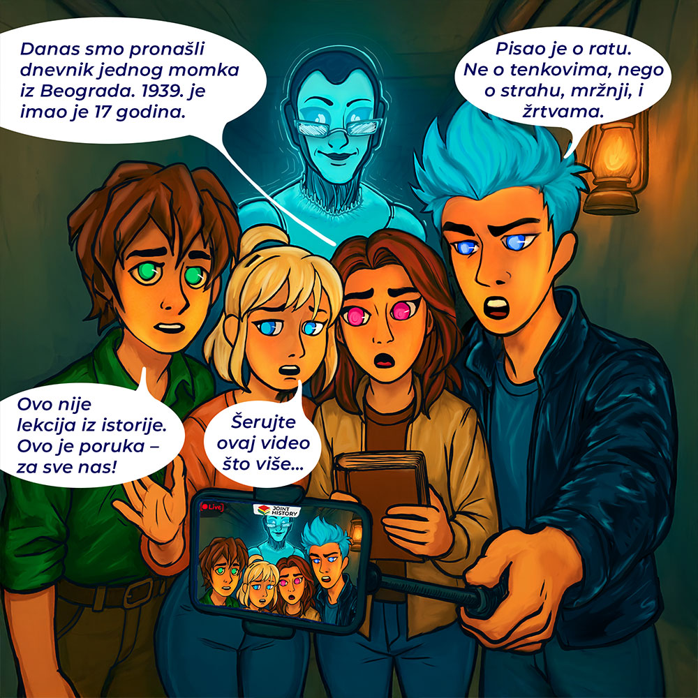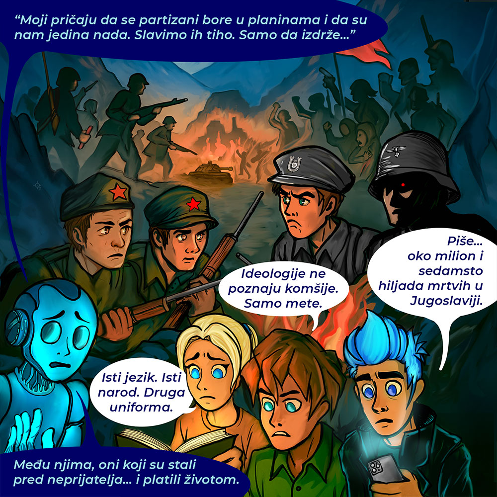 U ovom stripu, naši učenici prate tanku nit solidarnosti koja se provlačila kroz najmračnije trenutke istorije. Izvan naslova o ratovima i granicama, oni otkrivaju priče o uzajamnoj pomoći i zajedničkoj ljudskosti koje su prevazilazile nacionalne i ideološke podele. Ali, da li je solidarnost prirodni ljudski instinkt ili krhki izbor koji moramo iznova donositi? Možemo li ponovo otkriti snagu zajedništva u svetu koji nas često uči da smo ostavljeni sami sebi?