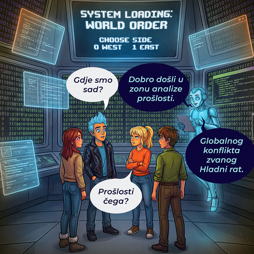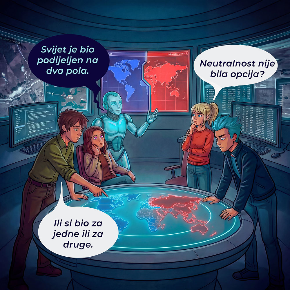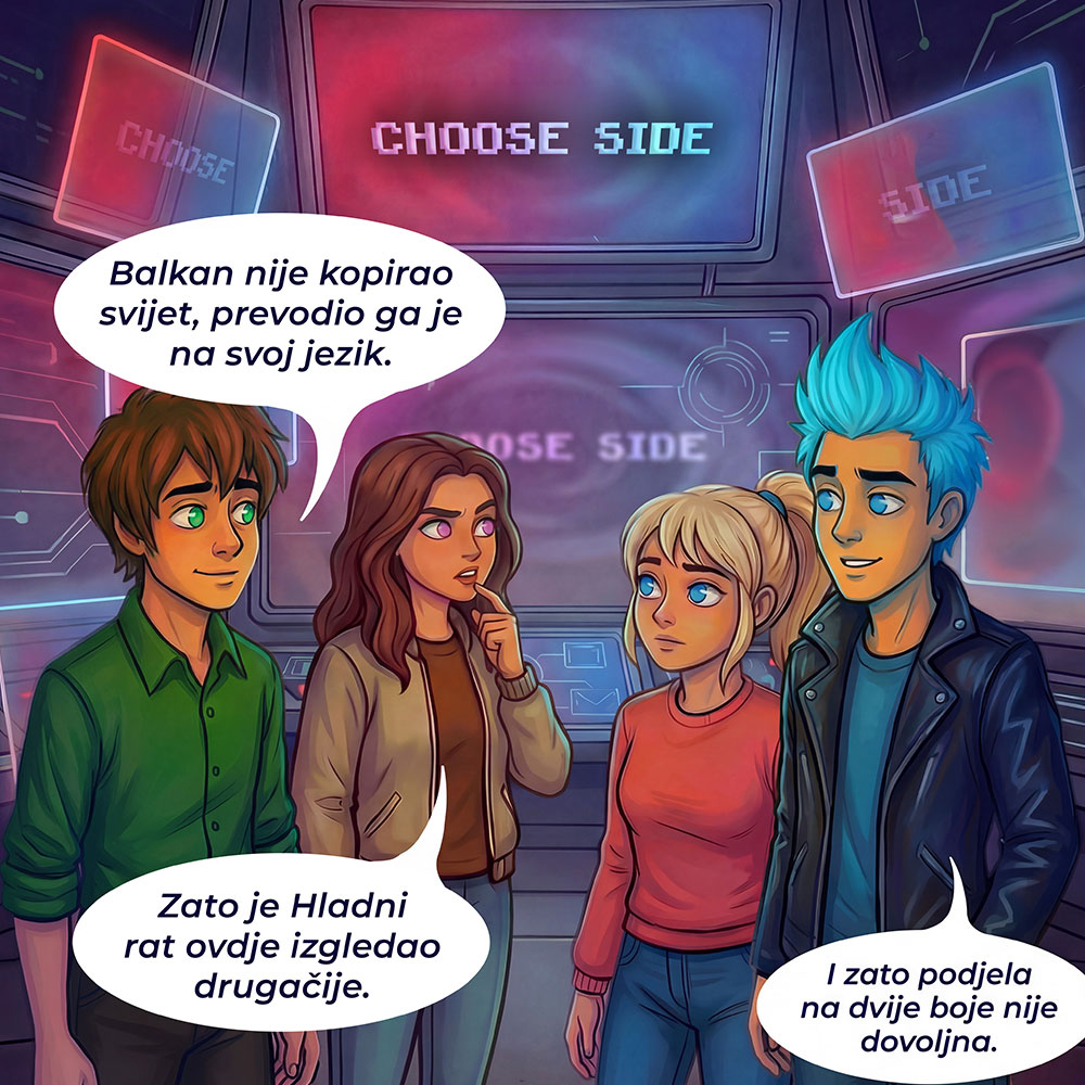 U ovom stripu, učenici istražuju svet podeljen gvozdenom zavesom, ali se nalaze na jedinstvenom prostoru između dva bloka. Dok ispituju poziciju socijalističke Jugoslavije, kreću se kroz primere globalnih tenzija i delikatnog balansiranja Pokreta nesvrstanih između njih. Da li je moguće ostati nezavisan kada svet zahteva da izaberete stranu? Može li “treći put” zaista premostiti jaz između dva suprotstavljene super sile ili je neutralnost samo krhka iluzija u svetu supersila?