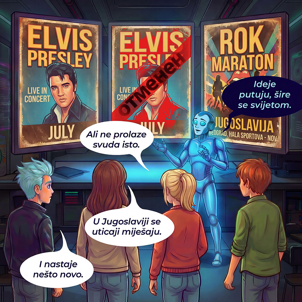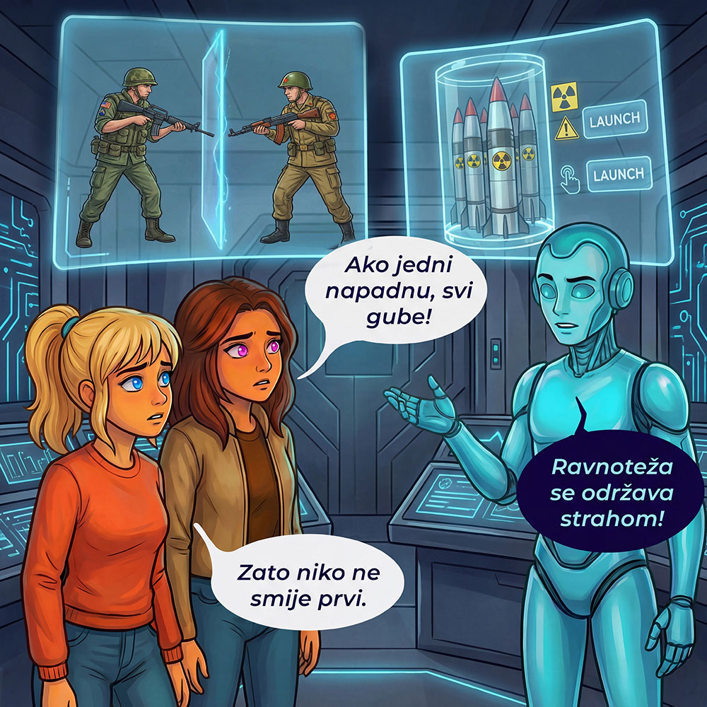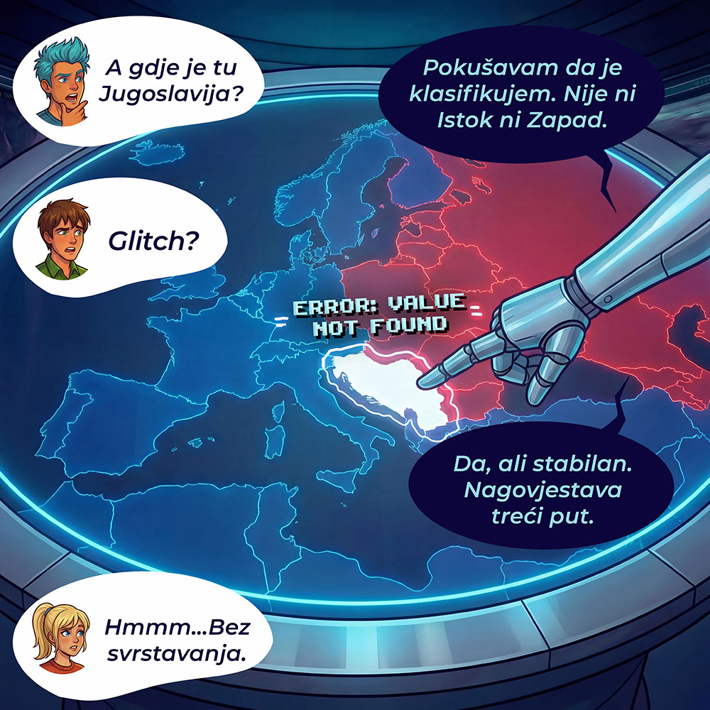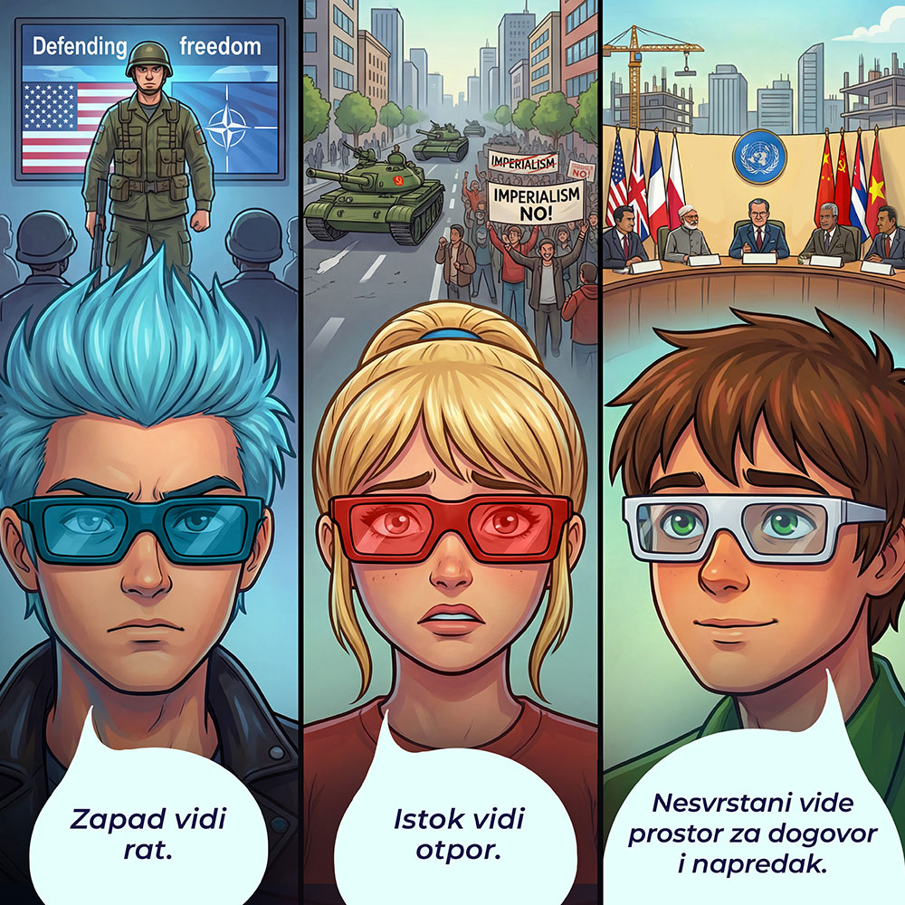 U ovom stripu, učenici istražuju svet podeljen gvozdenom zavesom, ali se nalaze na jedinstvenom prostoru između dva bloka. Dok ispituju poziciju socijalističke Jugoslavije, kreću se kroz primere globalnih tenzija i delikatnog balansiranja Pokreta nesvrstanih između njih. Da li je moguće ostati nezavisan kada svet zahteva da izaberete stranu? Može li “treći put” zaista premostiti jaz između dva suprotstavljene super sile ili je neutralnost samo krhka iluzija u svetu supersila?