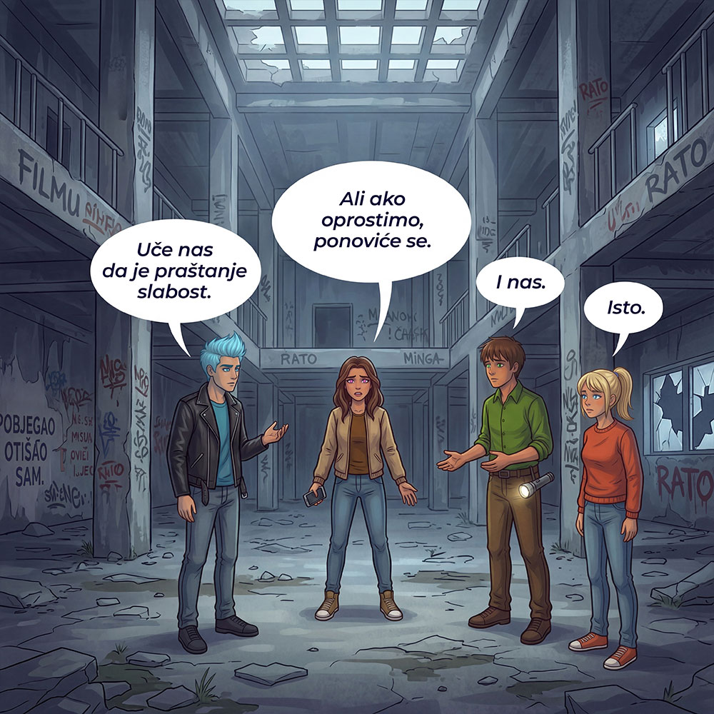 Senka brojnih prošlih ratova i dalje se nadvija nad našom sadašnjošću i budućnošću. Kroz razgovor, naši junaci istražuju kako se ciklusi nasilja perpetuiraju – često mimo naše volje. Da li smo osuđeni da večno ponavljamo iste greške ili postoji put ka prekidu starih obrazaca i stvaranju nečeg novog?