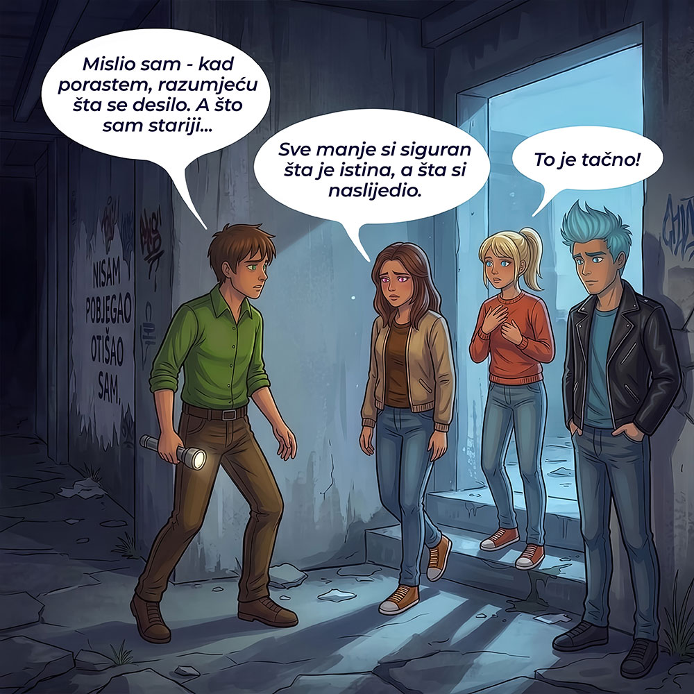 U drugom stripu, duhovi prošlosti pojavljuju se tamo gde ih najmanje očekujemo — među mladima neopterećenim nacionalnim predrasudama. Ipak, nacionalni mitovi izbijaju na površinu tokom rasprave o istorijskim događajima. Da li je moguće učiti istoriju bez ponavljanja uvek istih starih narativa?