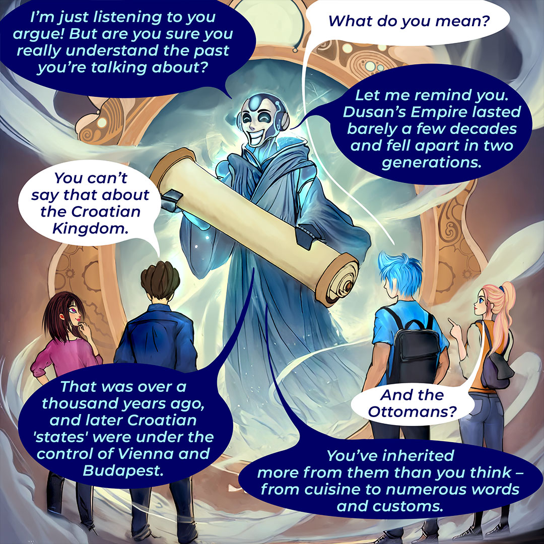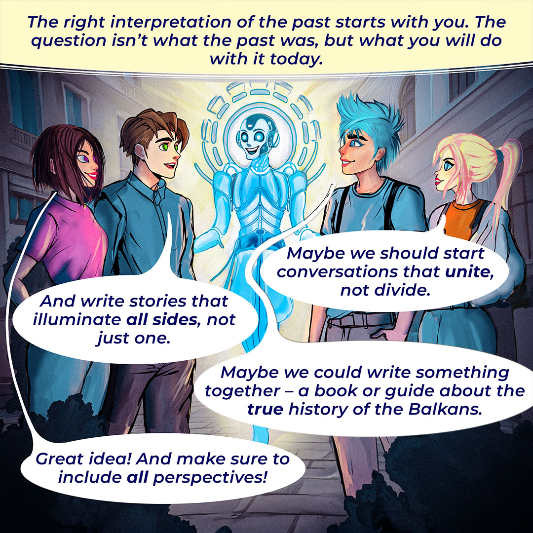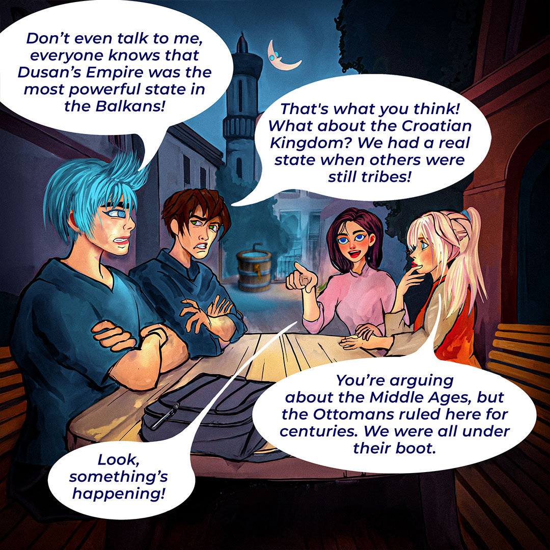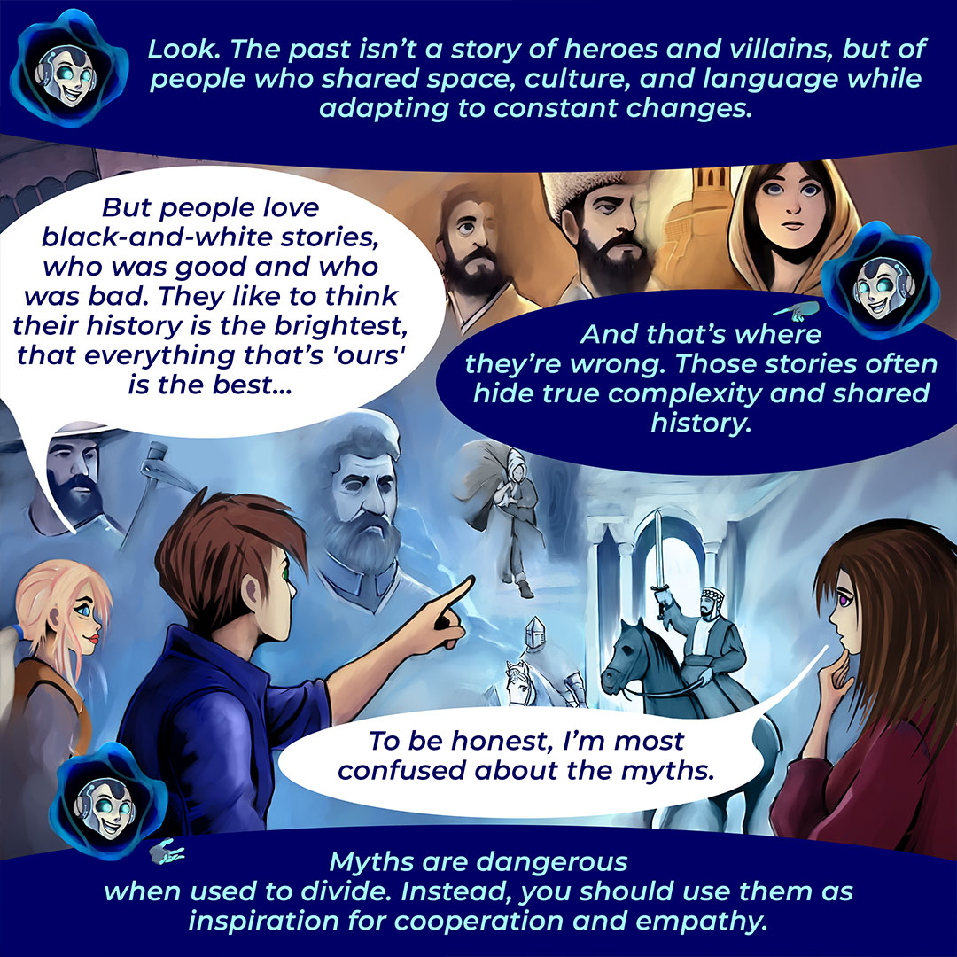 Στο πρώτο κόμικ παρακολουθούμε μαθητές που εξερευνούν την Οθωμανική Αυτοκρατορία με τη βοήθεια εργαλείων τεχνητής νοημοσύνης. Η τεχνολογία ανοίγει νέες πόρτες στην κατανόηση της ιστορίας, αλλά όχι χωρίς κινδύνους και ερωτήματα. Πώς μπορούμε να αναγνωρίσουμε τη λεπτή διαφορά ανάμεσα σε ένα χρήσιμο εργαλείο και σε μια υπεραπλουστευμένη ερμηνεία του παρελθόντος;