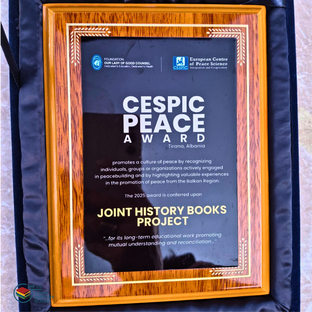 TIRANA, 11. mart – Projekat zajedničkih istorijskih čitanki (www.jointhistory.net) dobitnik je ovogodišnje nagrade za mir koju dodeljuje Evropski centar za nauku o miru, povezivanje i saradnju (CESPIC) iz Tirane, u saradnji sa Balkansko-kavkaskom transevropskom opservatorijom (OVCT) sa sedištem u Trentu.